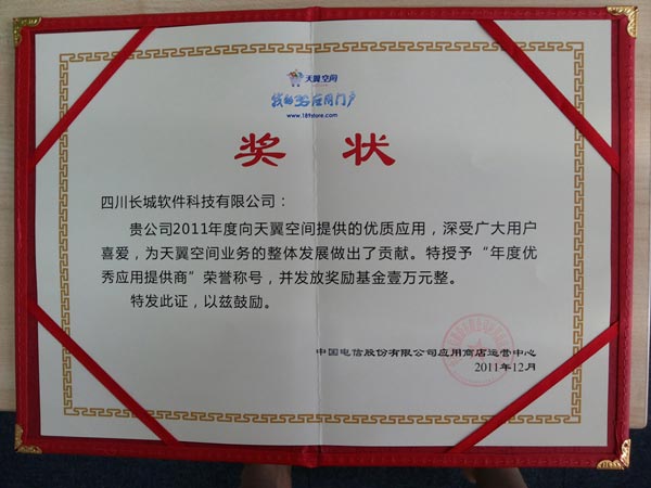 2011年12月,中國電信應用商店運營中心授予四川長城軟件科技有限公司“年度優秀應用提供商”榮譽稱号,以感謝長城軟件爲天翼空間業務的整體發展做出的貢獻。